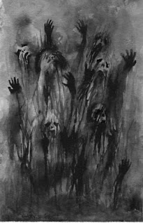 Eventually the catch up to the beast and they can hear the sickening sound of flesh pulled from bone. 30ft up ahead they can see the huge black wolf-like creature tearing into the woman's torso pulling steaming innards out with each tug that then fall lazily in the mud. The wolfthing turns and sees the party, it rises to its hind legs then howls at the moon. Initiative is rolled.